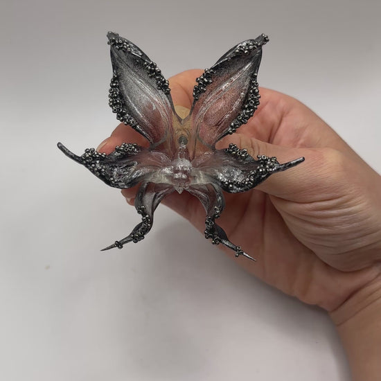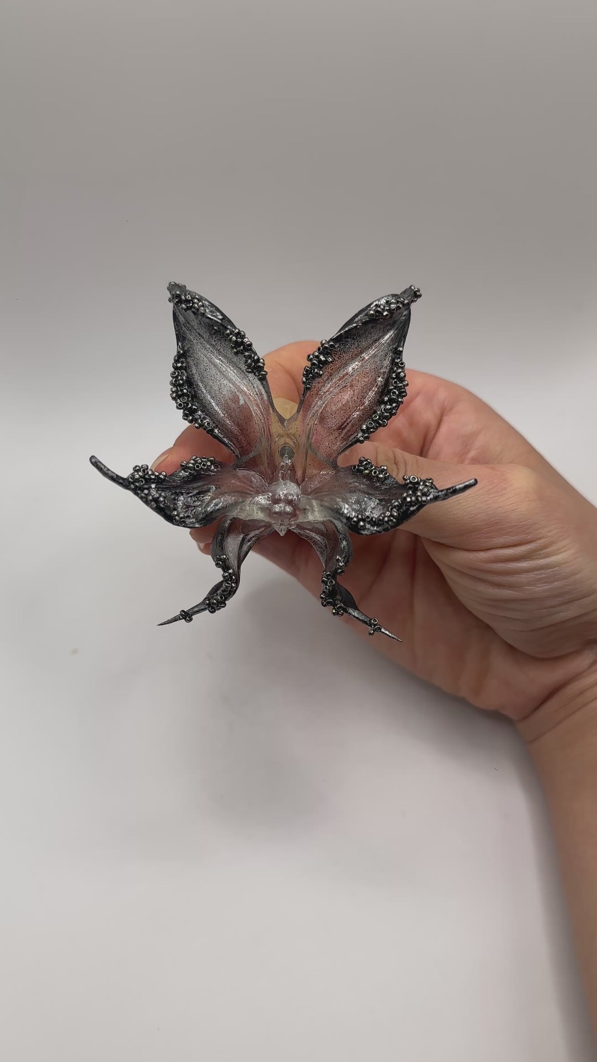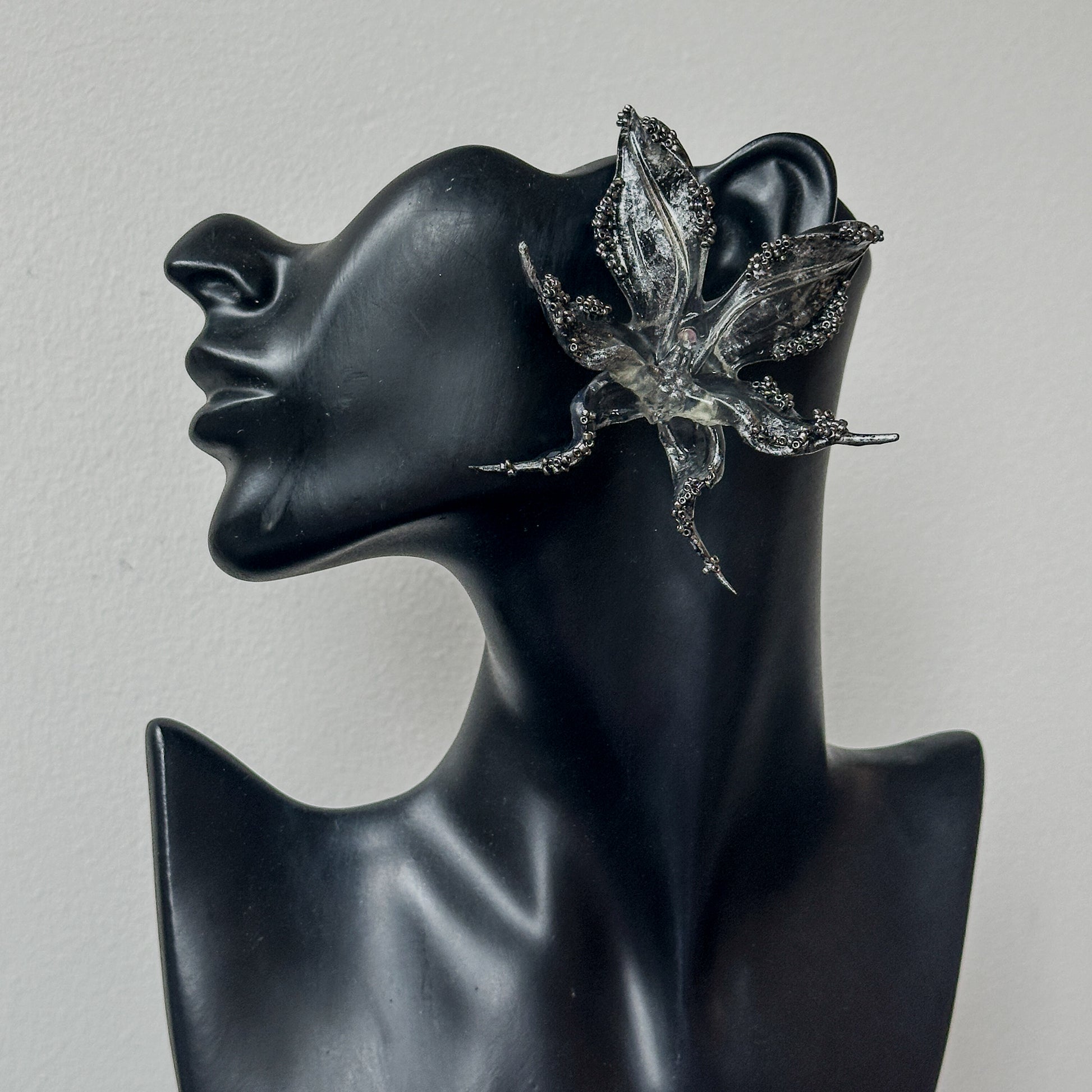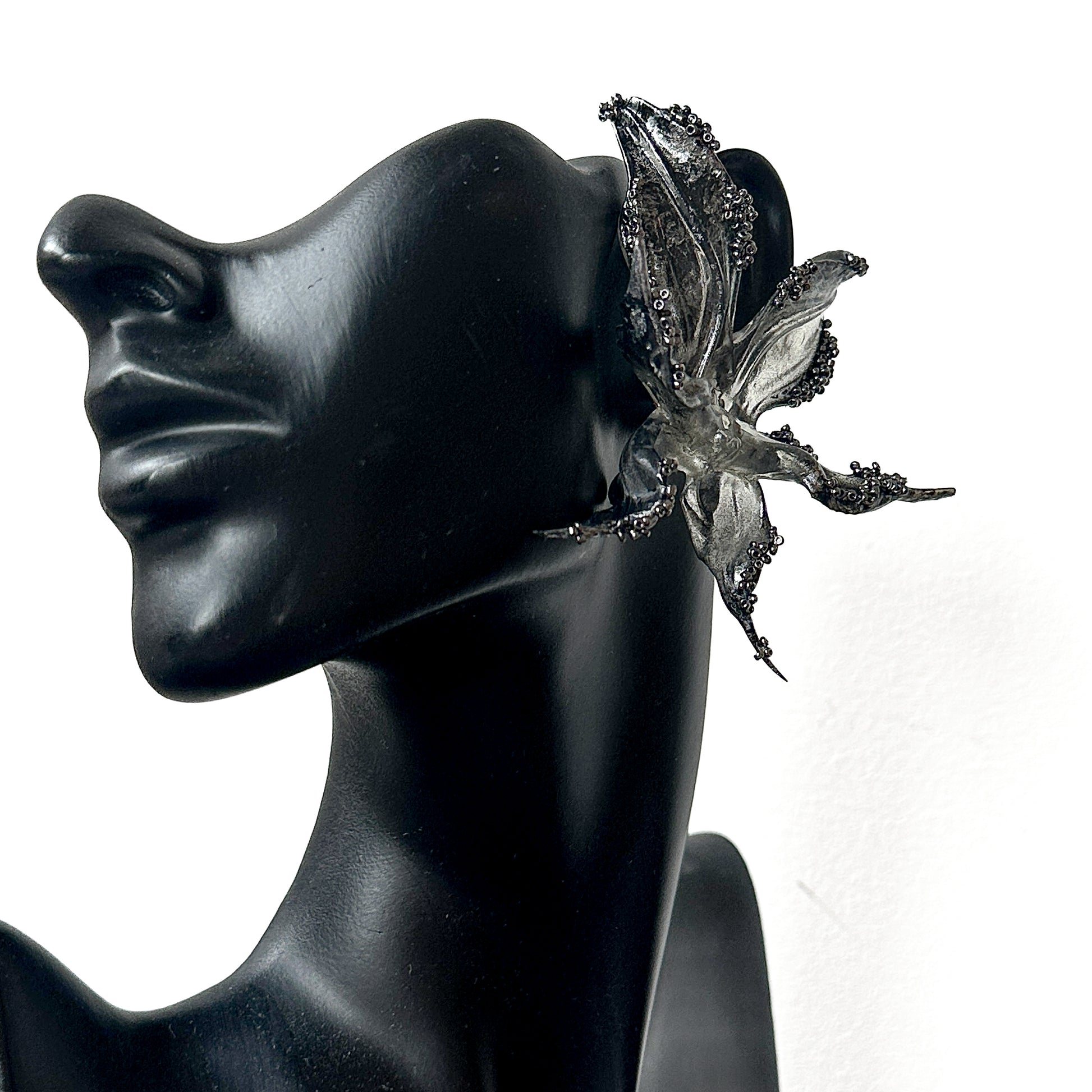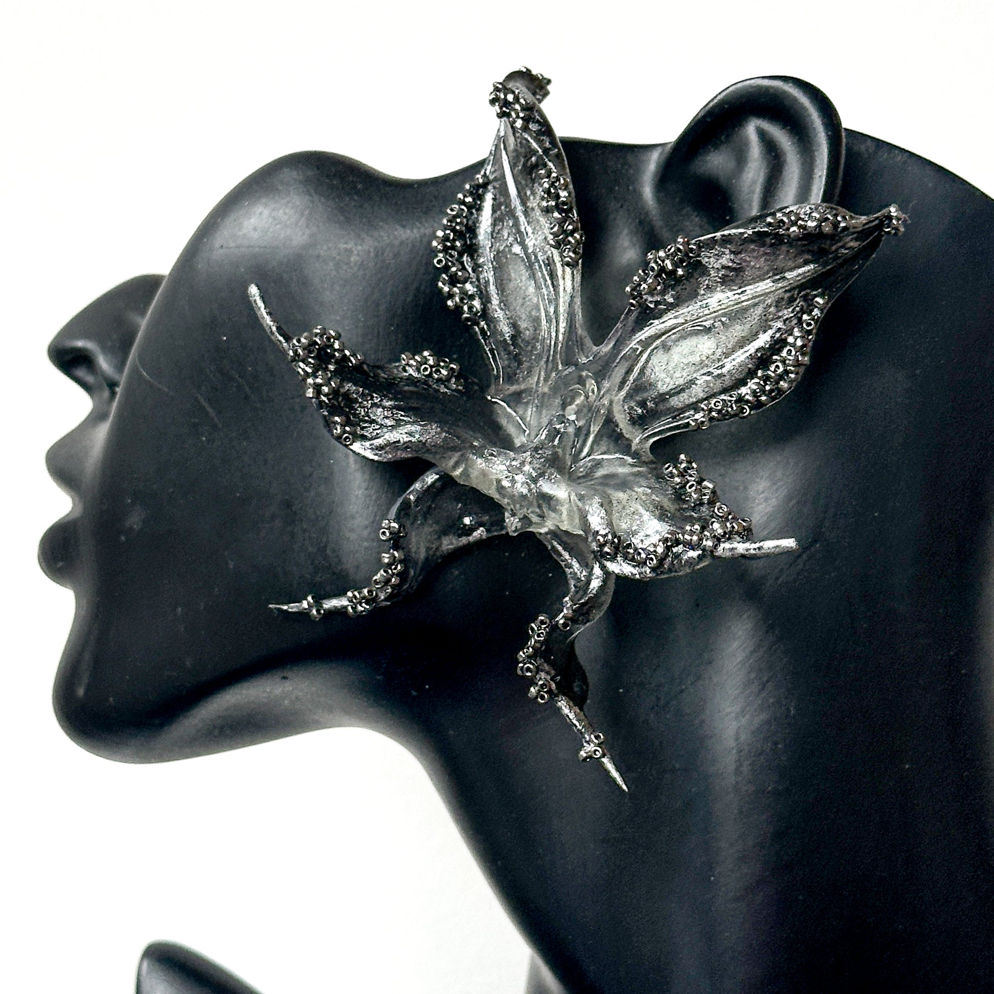 These exquisite statement earrings celebrate the harmony of 3D printing and fashion textile craftsmanship. Created in small batches, each pair is meticulously handcrafted and coloured, 3D-printed in resin, hand-finished with metallic silver coating beads. Detailed with fine beaded accents that reflect light with a soft, moonlit glow.