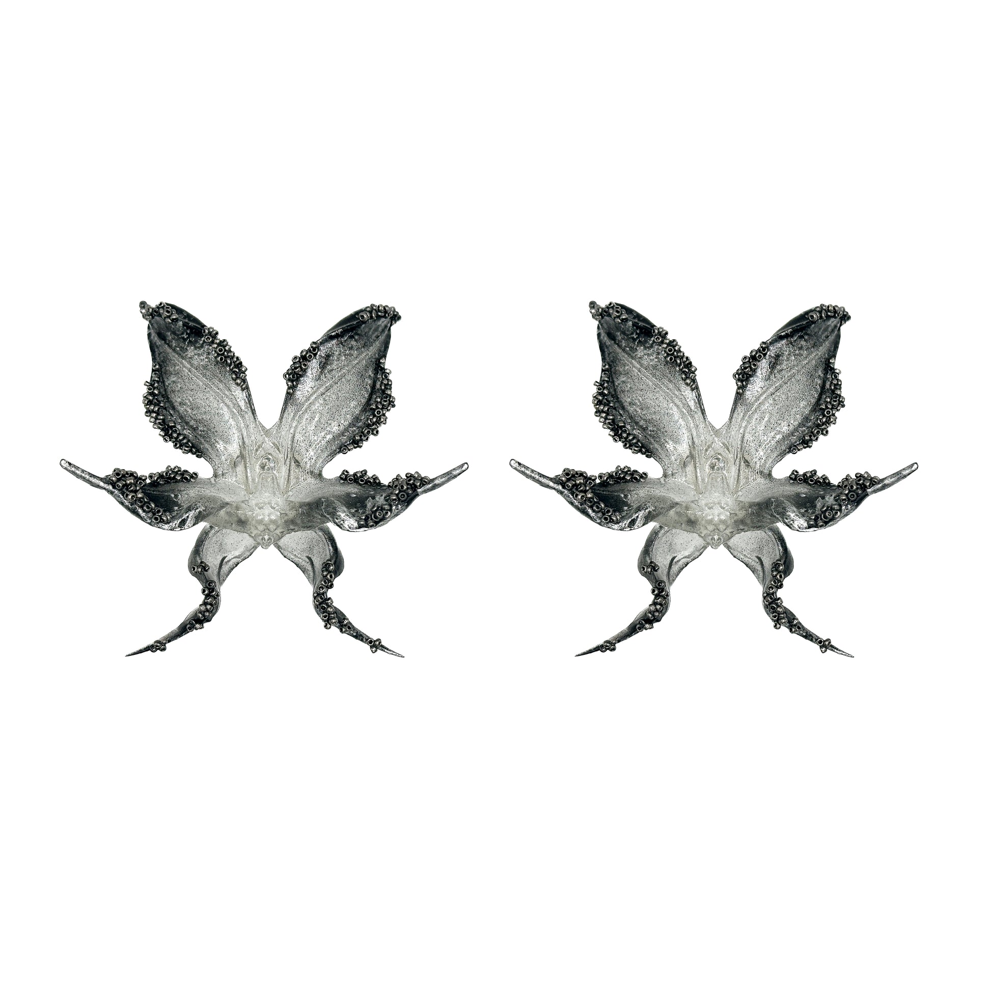 Silver orchid earrings with a soft, luminous shine. The beaded details catch the light, creating a delicate, moonlit effect.